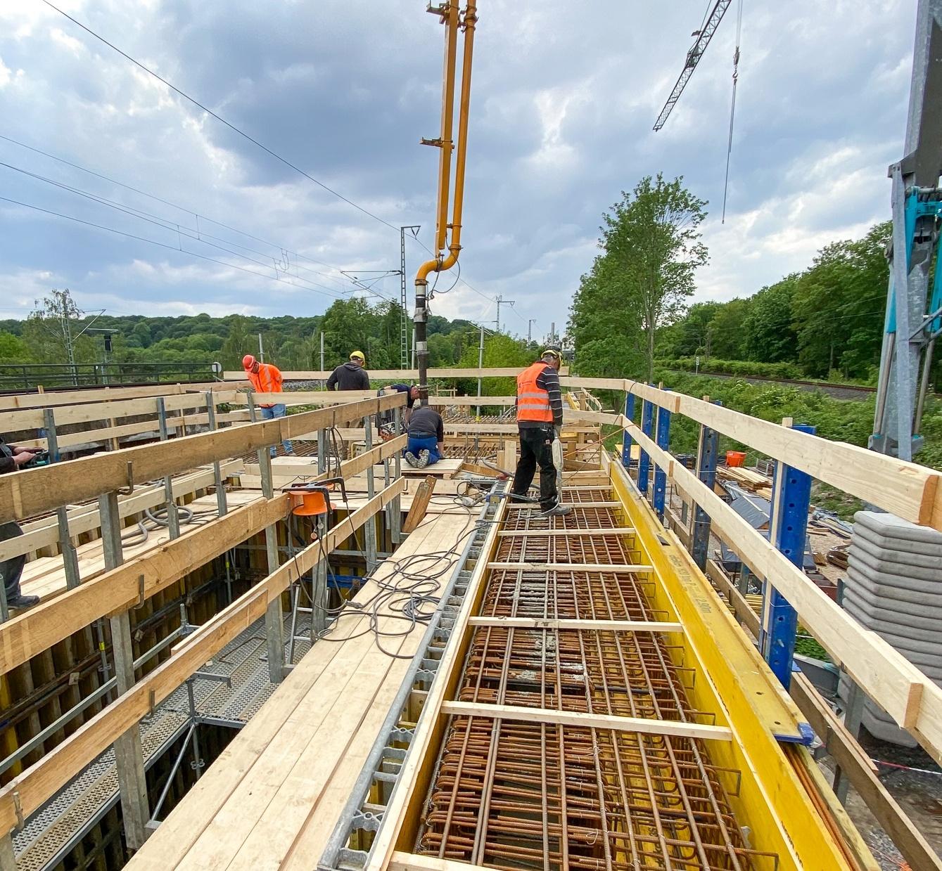 Am 13.05.2020 fand eine große Widerlager-Betonage statt, bei der rund 100 m³ Beton in Form gebracht wurden. Der Halbrahmen entsteht aktuell direkt neben dem Bestandsbauwerk. Um die vorgesehene Sperrpause für den Verschubvorgang vom 06. bis 14.07.2020 einhalten zu können, arbeiten unsere Kollegen im Moment auf Hochtouren im 2-Schicht-Betrieb mit jeweils 5 Kollegen pro Team.