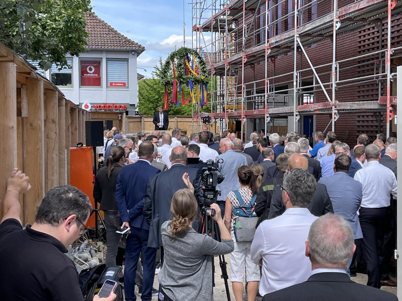 "Jetzt ist’s vollbracht, der Rohbau steht und über ihm der Richtkranz weht."