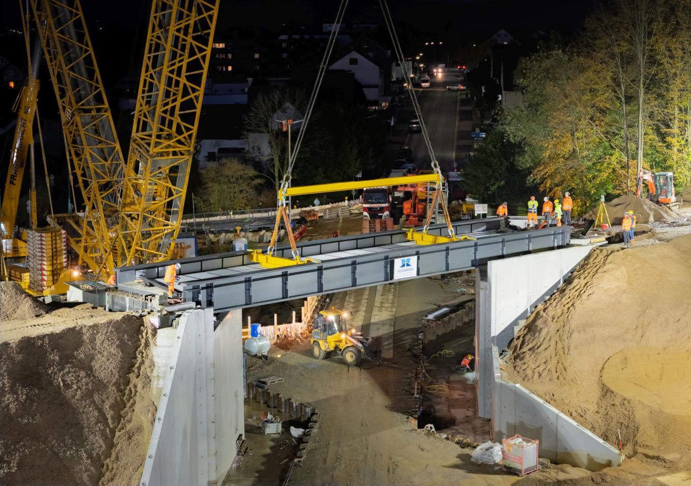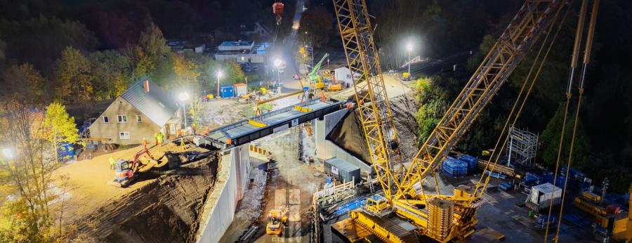 Nach dem Rückbau der alten Brücke Ende September, dem Herstellen der Baugruben und dem Einbau der neuen Widerlager aus Betonfertigteilen stand Ende Oktober der nächste große Meilenstein an: der Einhub des neuen Überbaus. Am Dienstag, den 28.10.2025, wurde der neue Stahlüberbau erfolgreich eingehoben. Dieser Schritt markiert einen wichtigen Fortschritt beim Ersatzneubau. Der rund 149 Tonnen schwere Überbau mit Abmessungen von 26,11 × 8,00 Metern (inklusive Laufwege) wurde zuvor per Schiff und Lkw von Emlichheim nach Löhne transportiert. Für den spektakulären Hub kam ein 650-Tonnen-Raupenkran zum Einsatz. Der Hub startete um 16:30 Uhr und war um 19:00 Uhr erfolgreich abgeschlossen – millimetergenaue Arbeit, perfekte Koordination und echte Teamleistung.