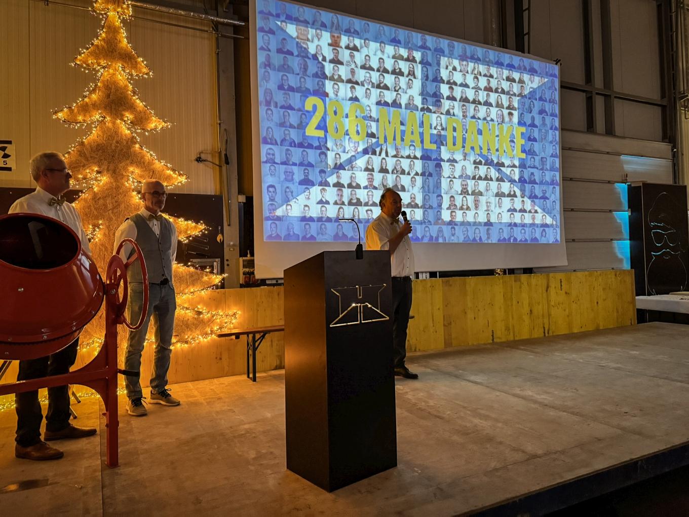 Nach dem offiziellen Teil ging es in den geselligen Teil des Abends über. Bereits am Eingang der Schalungshalle wartete ein echtes Highlight: unser neuer Volvo EC400. Mit über 40 Tonnen Einsatzgewicht und ausgestattet mit einer neuen MOVAX-Anbauramme wird uns diese leistungsstarke Maschine ab dem kommenden Jahr auf unseren Baustellen entscheidend voranbringen – ein echter Hingucker und ein starkes Zeichen für die Zukunft. Für das leibliche Wohl war ebenfalls bestens gesorgt: Die Getränke wurden von unseren Kolleginnen und Kollegen aus der Verwaltung ausgeschenkt – stilecht aus unseren eigenen Schankwagen. Ein schönes Beispiel für gelebten Teamgeist über alle Bereiche hinweg.