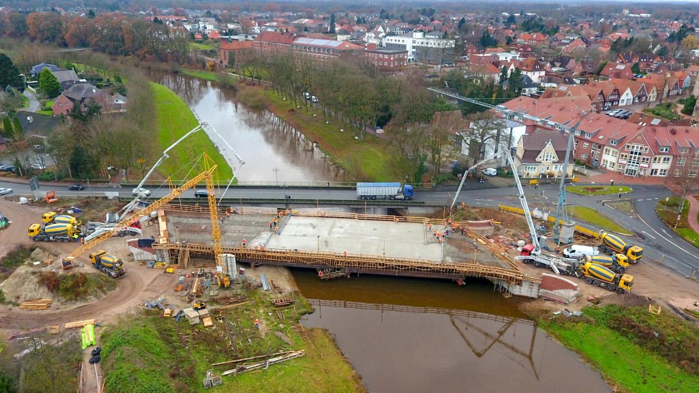 Am 24.10.2016 erhielten wir von der Niedersächsischen Landesbehörde für Straßenbau und Verkehr (Geschäftsbereich Lingen) den Auftrag für den Abbruch der vorhandenen Geh- und Radwegbrücke, sowie für den Ersatzneubau der Hasebrücke H1 im Zuge der B213 in Haselünne. Der Ersatzneubau ist aufgrund des schlechten Gesamtzustandes des vorhandenen Bauwerks sowie die Ergänzung eines Radwegs notwendig.