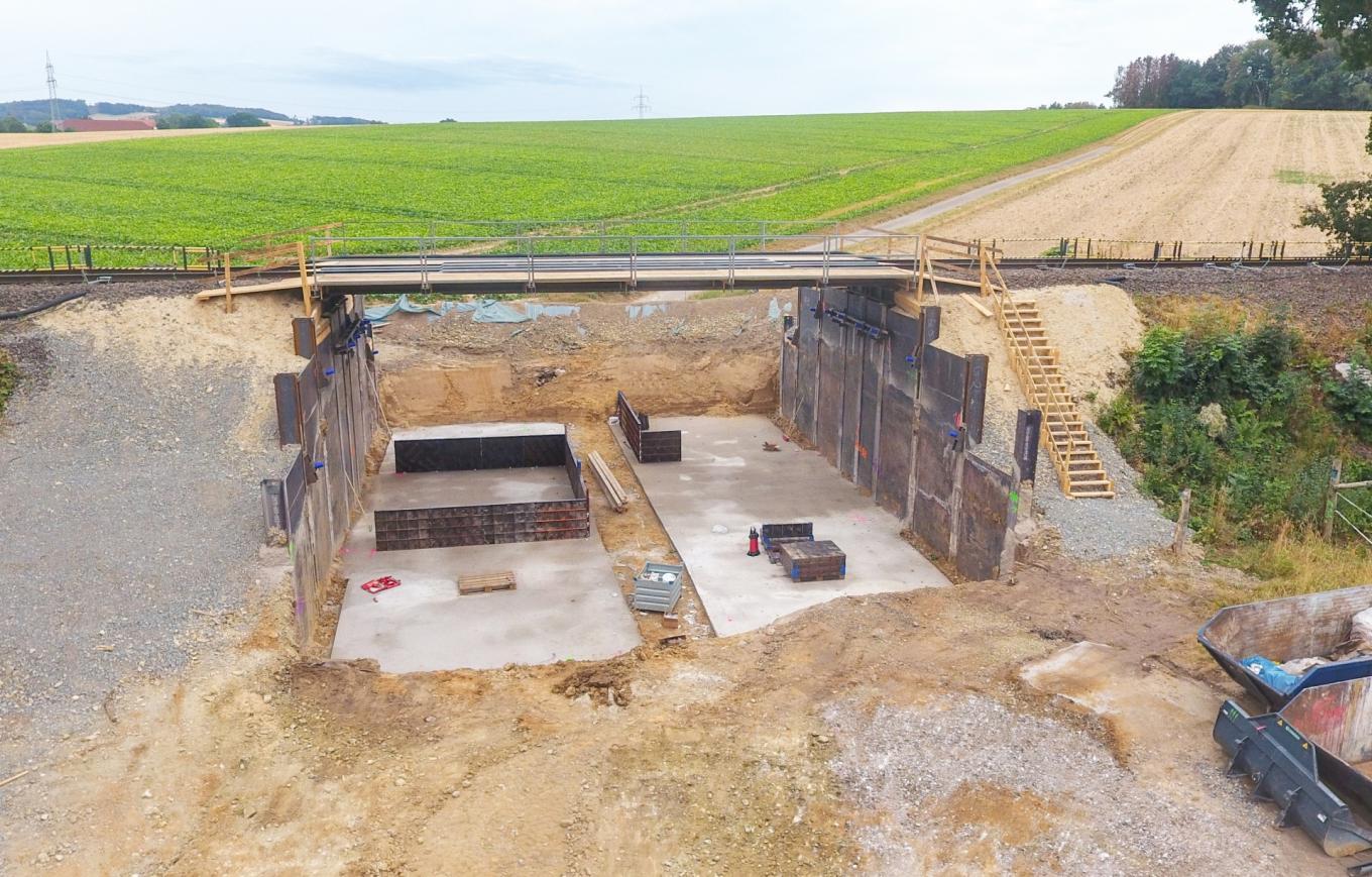 Am 14.05.2018 erhielten wir von der Deutschen Bahn AG den Auftrag zur Erneuerung der Eisenbahnüberführung (EÜ) "Feldweg" in Lage/Hardissen (Strecke 2983). Im Bereich des Bauwerks verläuft eine eingleisige nicht elektrifizierte Trasse der Deutschen Bahn in einer Dammlage. Die vorhandene EÜ (Baujahr 1886) bestand aus einem Stahlüberbau auf flach gegründeten Schwergewichtswänden. Der Einfeldträger hatte eine lichte Weite von 3,80 m bei einer Breite von etwa 4,40 m.