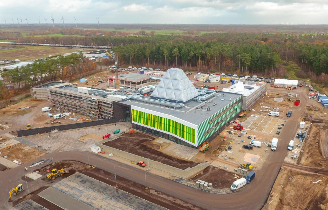 Der Gebäudekomplex gliedert sich in die Bereiche Verwaltungsgebäude mit Kantine, Feuerwehrgebäude, Feuerwehrübungsgebäude mit Übungsturm, Werkstätten und Labor. Bis auf das Feuerwehrübungsgebäude sind alle Teile miteinander verbunden. Die Verwaltung ist als dreigeschossiges zentrales Bürogebäude ausgeführt worden und dient als Verteiler zu den weiteren Gebäudebereichen. Sie wird über den dreigeschossigen Eingangsbereich erschlossen und umschließt einen Atriumhof, der durch eine transparente Dachpyramide geschützt wird. Alle weiteren Gebäudeteile binden vorzugsweise als zweigeschossige Gebäude sternförmig an das Verwaltungsgebäude an. In einem kleinen Bereich unter der Feuerwehr ist eine Teilunterkellerung für Technikräume entstanden. Das Feuerwehrübungsgebäude wird als separater Baukörper nördlich des Feuerwehrgebäudes errichtet.